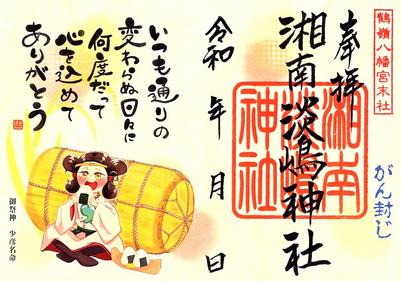 Item 授与品・御朱印 限定御朱印 ゆたかさ詣で(初穂料500円) 湘南淡嶋神社(初穂料500円)秋限定です しあわせ詣で(秋)初穂料500円 11月のえぼし麻呂 外で遊ぼうバージョン前半 11/1~11/15 紅葉の銀杏バージョン後半 11/16~11/31 御朱印帳 御朱印帳(表)御本殿と大銀杏 御朱印帳(裏)神輿とえぼし岩茅ヶ崎市特別観光大使「えぼし麻呂とミーナ」 御朱印帳の裏には龍体文字が入っています意味は「心と心で繋がりあえる出会いを促し縁を結ぶ」 御朱印帳用バンドとビニールカバーもあります 御守 御守のご案内 龍神守末社・懐島弁財天の御守初穂料 1,000円 ぼけ封じ御守根付の紐の色は複数あります初穂料 1,000円 結び守神様や人をはじめ色々なご縁を結びます白色と桃色の2種類あります初穂料 各種1体 1,000円 勝守文化3年に造られたと伝わる鶴嶺八幡宮の御神輿初穂料 500円 癌封じ御守末社・湘南淡嶋神社の御守初穂料 1,500円 一粒万倍守守袋型とカード型の2種類あります初穂料 各種1体 1,000円 天神守合祀・鶴嶺天満宮(御祭神・菅原道真)学業成就や合格の御守初穂料 500円